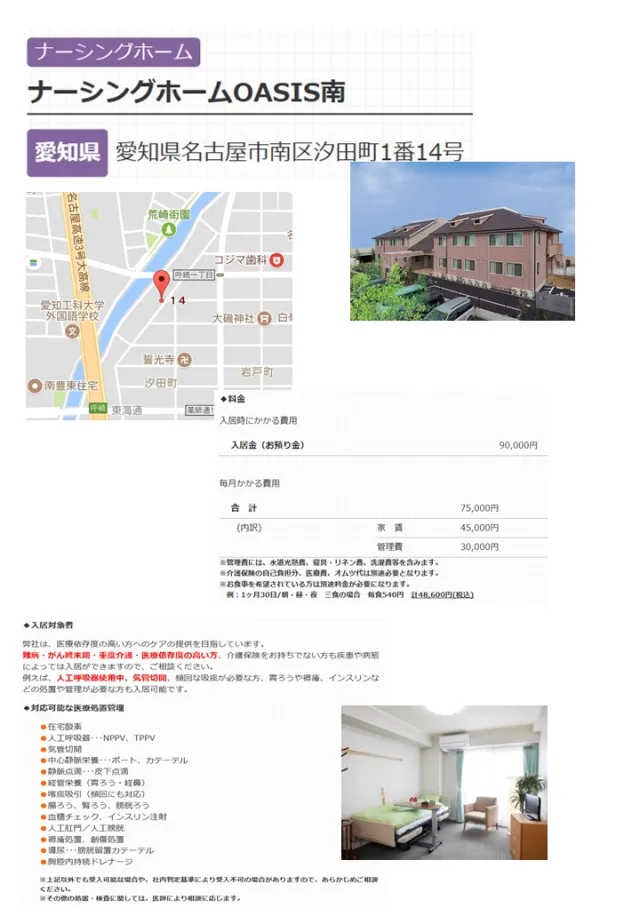 | 施設コメント | 名古屋市南区汐田町にある、がん・難病患者・重度介護者のための住宅型有料老人ホームです。お部屋は全室個室と快適にお過ごしいただけます。介護士、看護師ともに24時間体制で常駐しており、安心です。身体状態に合わせた、充実の入浴設備を整えています。 |